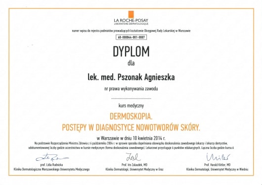 Absolwentka Wydziału Lekarskiego Śląskiej Akademii Medycznej w Katowicach z oddziałem Lekarsko – Dentystycznym w Zabrzu. Wiedzę i doświadczenie zdobywała podczas praktyk w Klinice Dermatologii Centralnego Szpitala Klinicznego Wojskowego Instytutu Medycznego w Warszawie oraz pracując jako Lekarz Orzecznik Rejonowej Wojskowej Komisji Lekarskiej w Warszawie. Członkini Polskiego Towarzystwa Dermatologicznego.