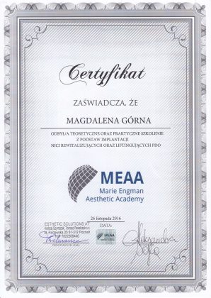 W obszarze medycyny estetycznej dr Magdalena Górna oferuje innowacyjne i bezpieczne procedury odmładzania i rewitalizacji skóry, takie jak stymulatory tkankowe, mezoterapię (w tym mezoterapię z osoczem bogatopłytkowym), nici PDO, zabiegi laserowe czy zabiegi przy zastosowaniu kwasu hialuronowego. Wykonywane przez nią zabiegi pozwalają na zachowanie naturalnego wyglądu oraz zapewniają szybki powrót do normalnych aktywności.